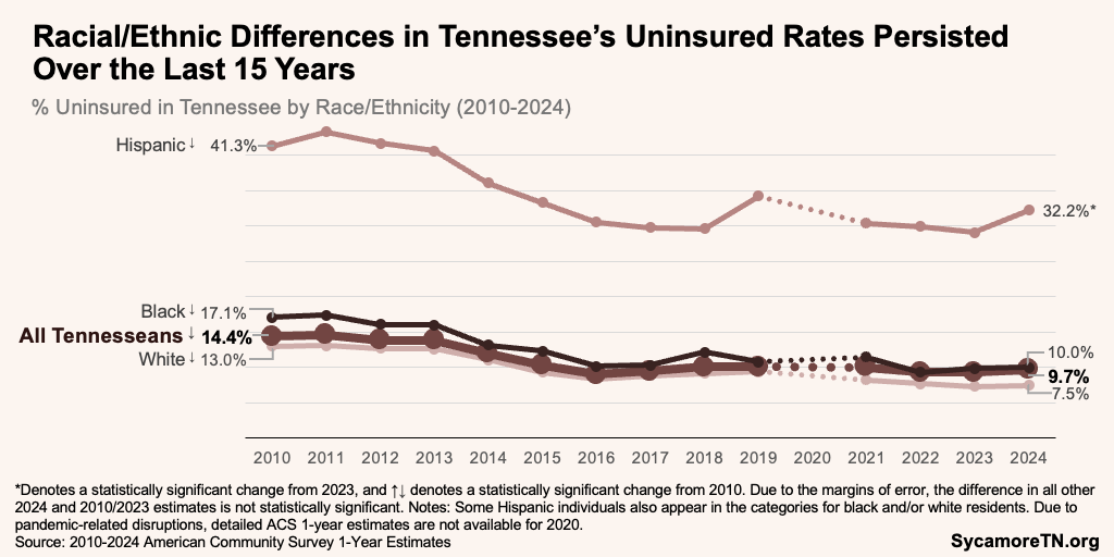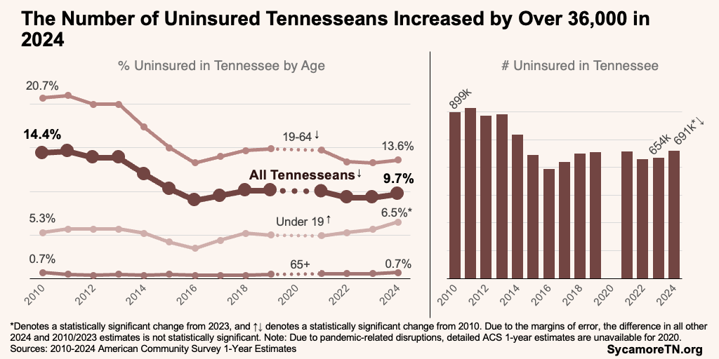 - The number of uninsured Tennesseans increased by over 36,000 between 2023 and 2024 (Figure 7).