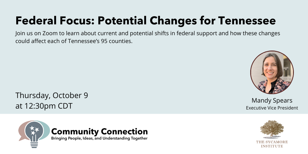 Join the Sycamore Institute for an overview of current and potential shifts in federal support, how these changes could affect each of Tennessee’s 95 counties, and more contextual information about how the federal and state budget processes work together.