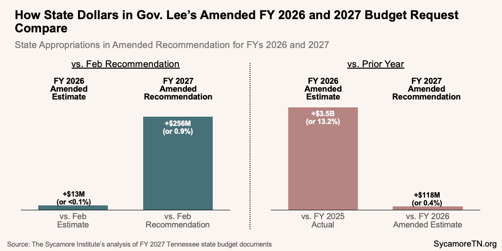 On March 24, 2026, Governor Lee proposed changes to his budget recommendation for FY 2027, which starts July 1, 2026. Known as the administration amendment, these revisions update the original budget plan rolled out in February, reflecting new information about program needs, available revenues, and legislative action.