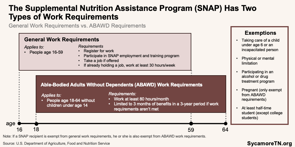 - ABAWD Work Requirement — Additional requirements also apply to able-bodied adults without dependents (ABAWD), who are otherwise subject to a three-month limit on benefits. Under the ABAWD requirement, recipients ages 18-64 without a dependent under 14 must report at least 80 hours of work per month to receive more than three months of benefits in a three-year period. (15) (16) Prior to the passage of the OBBB Act, the ABAWD requirement applied to recipients ages 18-54 without a dependent under 18. (17) (18) National estimates project that approximately 52,000 Tennesseans will now have to meet the ABAWD work requirement to continue receiving SNAP benefits. (19) (20)